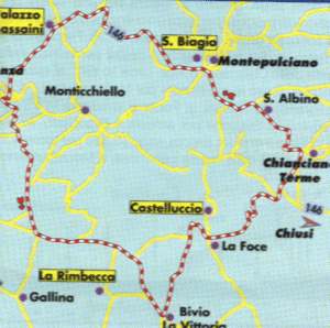 NOTE SULLA STORIA E SULL�AMBIENTE Questo percorso costituir� un�ottima occasione per una breve visita a Pienza, ma sar� difficile resistere al richiamo delle rocche, dei castelli e delle fattorie fortificate, che s�intravedono sulle alture circostanti. Inoltre, il cicloturista dovr� assolutamente farsi una "pedalata" per la Val d�Orcia; solo cos�, infatti, potr� ammirare un paesaggio che � di una "toscanit�" assoluta, ma che tuttavia presenta caratteri introvabili in altre zone della Toscana. E la Val d�Orcia � terra di contrasti esaltanti; alle nostre spalle, scalando le ultime salite, si stendono le "lunari" e brulle biancane di Lucciolabella, simbolo di una natura che ancora non si � piegata all�uomo; poco pi� in l�, invece, lungo i ripidi fianchi della collina, si aprono piccole radure coltivate a grano anche negli angoli pi� impervi. Poi le caratteristiche figure slanciate dei cipressi ad interrompere, come cesure in uno spartito, l�immenso paesaggio, e le stoppie, e i canneti solitari. E su tutto le presenze dei Monti Amiata e Cetona, e quella del fiume Orcia, che impugna il paesaggio e taglia in due la pianura per l�intera lunghezza.